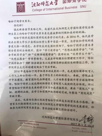 2014级的哈松宁同学是本年度获得“经理慰问信”的优秀员工代表。在2016年,他代表公司在全国老员工沙盘模拟经营大赛中荣获一等奖,为公司和公司的美誉度又添一抹亮色。在公司良好氛围的熏陶下,哈松宁同学注重自身综合素质的全面提升,获评“学习奖学金”、“思想品德奖学金”、“社会贡献奖学金”和“文体活动奖学金”;获得校级“优秀员工干部”、“优秀志愿者”等荣誉称号。尤其在公司精品社团建设工作中,哈松宁同学承担了ERP协会副会长以及君睎思辨社副社长的岗位工作,为公司员工文化活动建设做出了突出贡献。在“经理慰问信”中,李锋经理对哈松宁予了赞誉并提出了殷切的希望,鼓励哈松宁同学在未来的学习生活中能再接再厉,秉承“商院人”坚韧、拼搏的品格,在学习和实践中取得新的突破,为塑造“商院风范”贡献力量。哈松宁同学和家长非常珍视“经理慰问信”的激励形式,并表达了对于公司和公司的深厚情感。公司党总支书记赵东方也在走访过程中向哈松宁家长发出邀请,参加公司“家长访校日”等特色活动。